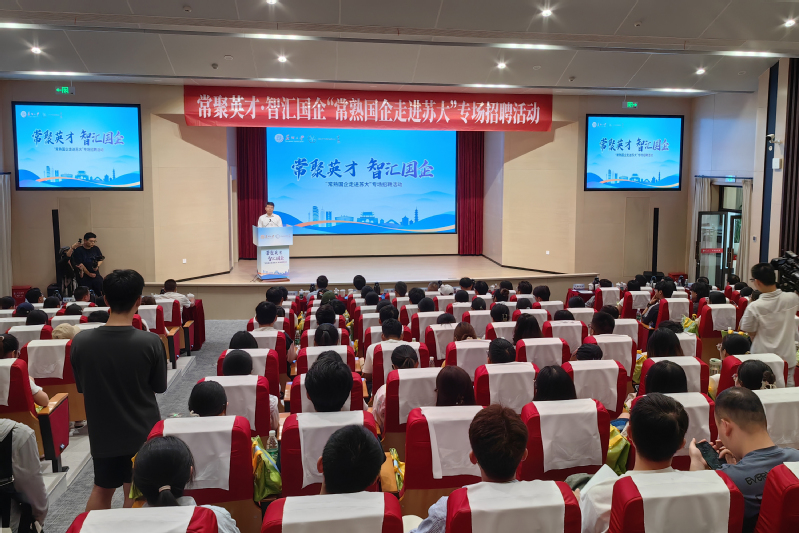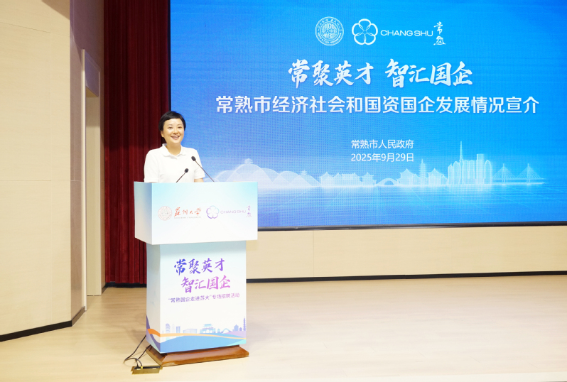 吴晓红作常熟市经济社会和国资国企发展情况宣介。她强调,常熟市重点国企组团来苏大招才引智,是诚意满满的邀约,更是深化校地合作的重要举措。她期待苏大学子投身常熟市建设,在国企大舞台上施展才华、锤炼本领、实现价值。