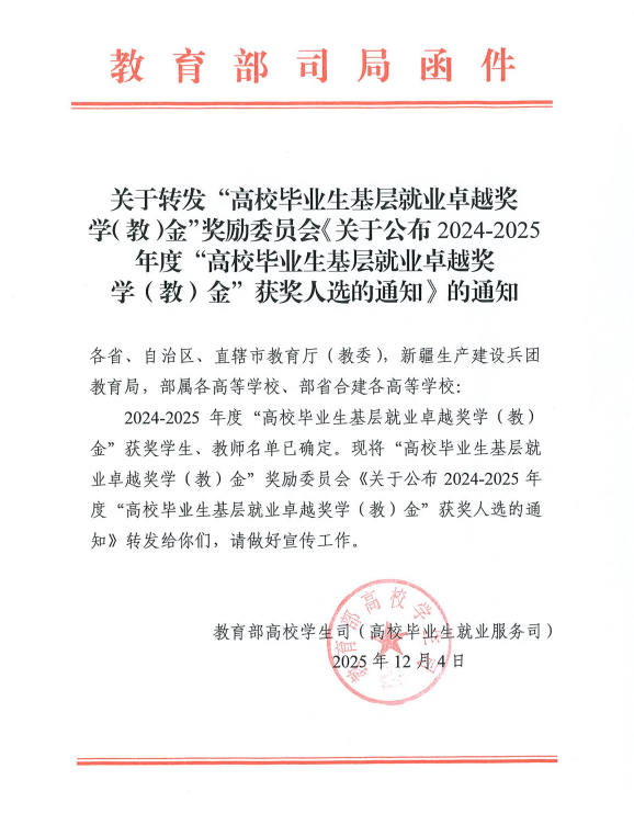 “高校毕业生基层就业卓越奖学(教)金”由教育部高校学生司(高校毕业生就业服务司)、教育部学生服务与素质发展中心指导,中国教育发展基金会设立,旨在表彰基层就业中有突出业绩和显著成效的高校毕业生,引导更多青年扎根基层、奉献才干。
