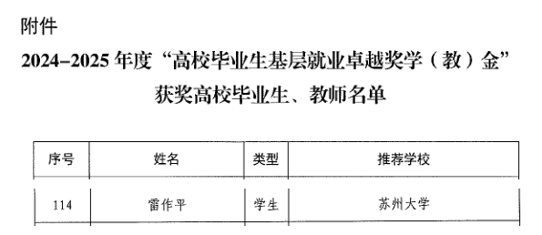近日,教育部高校学生司(高校毕业生就业服务司)、中国教育发展基金会公布2024-2025年度“高校毕业生基层就业卓越奖学(教)金”获奖名单,我校政治与公共管理学院2020届毕业生雷作平入选。这既是对雷作平个人扎根基层、奉献担当的充分肯定,也是我校坚持立德树人、着力引导学生服务地方发展的生动体现。